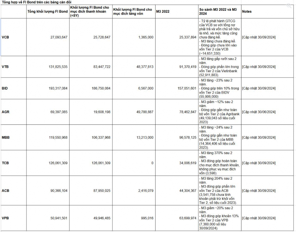 Lấy ví dụ TCB (Ngân hàng Thương mại Cổ phần Kỹ Thương Việt Nam – Techcombank) đi. Trong năm tới tháng 9/2024, nguồn vốn tăng nhiều nhất của TCB chắc chắn không phải huy động. Nguồn tăng mạnh nhất đến từ phát hành GTCG (giấy tờ có giá – mình hay gọi là M3). Trong tổng tài sản tăng lên 78 nghìn tỷ VND (78k bio), thì tổng phát hành tăng lên 41 nghìn tỷ VND (41k bio), còn lại là VCSH (vốn chủ sở hữu) và huy động. Nếu xét trong 2 năm, con số tăng trưởng của TCB là 370% từ cuối 2022 tới 2024. Có thể mình đang lấy một trường hợp hơi đặc biệt, nhưng nếu xét trong top các ngân hàng, gồm Big4 và nhóm NHTM (ngân hàng thương mại) mà mình hay gọi là “nhóm lên Big”, thì việc tăng trong phát hành giấy tờ có giá là cao (riêng với trường hợp VPB – Ngân hàng Thương mại Cổ phần Việt Nam Thịnh Vượng – vì trước đó có bán vốn và tăng VCSH). Vậy chung quy là gì? Là cơ cấu nguồn đang chuyển về dài hạn. Có nhiều lý do dẫn tới vấn đề này.