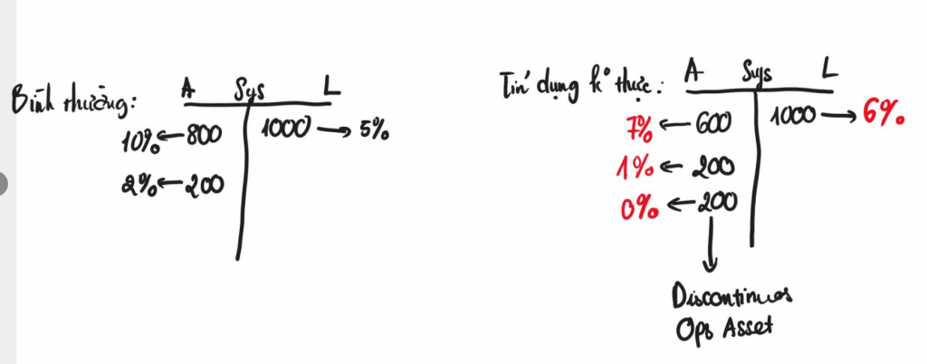 Nếu hệ thống bình thường, Asset (tài sản) sẽ trả COF (Cost of Funds – chi phí vốn) cho Liability (nợ phải trả), và bảng cân đối cứ thế hoạt động bình thường. Nhưng khi có quá nhiều tái cấu trúc, giãn hoãn nợ, hệ thống sẽ có nhiều Discontinous Ops Asset mà bản chất không sinh ra lời – lời này chỉ có trên sổ sách, dần dần sẽ bị đẩy một cục lên cân đối dưới dạng other asset (tài sản khác). Phải nói lại, trước khi “té” (sụp đổ), quy mô other asset trên cân đối của SCB (Ngân hàng Thương mại Cổ phần Sài Gòn) là 30%. Trong khi đó, ở side liability, bắt buộc phải issue (phát hành) những nguồn dài (M3, Equity – vốn cổ phần), mà ở đó COF lớn hơn nhiều so với inflow (dòng tiền vào) bên trên. Nó dẫn tới hệ quả: Hệ thống vẫn ghi nhận lợi nhuận kế toán nhiều, nhưng lại chả thể thu được. Dần dần, trong mình, ai rồi cũng có một SCB nếu tiếp tục để mấy chiếc Zombie tồn tại.