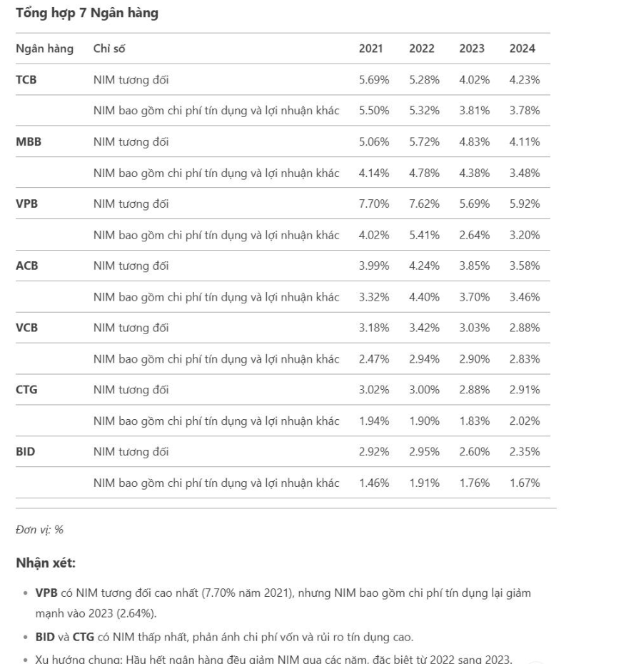 Chuyện là hơn 2 năm qua, bank bị hurt (tổn thất) NIM khá mạnh, nhất là nhóm Tier 2 (MBB, TCB, VPB, ACB), do đặc thù cân đối – tín dụng (xem bảng dưới, nhờ Deepseek tổng hợp từ data của bọn mình). Việc NIM bị hurt một phần rất lớn đến từ cái mà người trong ngành ALM (Asset-Liability Management – quản lý tài sản và nợ) gọi là “maturity transform” (chuyển đổi kỳ hạn), thứ quyết định tới hơn 60% COF của bank (như chuyên gia real (thực thụ) ưa thích của Admin nhận định, mình thì nghĩ nó còn cao hơn).