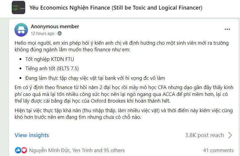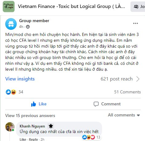 Mình là thế hệ thứ 2-3 gì đó, không phải đầu tiên, đi học CFA khi còn là sinh viên. Với mình lúc đó, CFA giống như thẻ vào ngành và xin việc ngoan. Giờ các bạn sinh viên có điều kiện hơn, giỏi hơn, nên thấy CFA bình thường là đúng, chứ hồi xưa mình còn thấy nó khó hơn kiến thức đại học một chút.