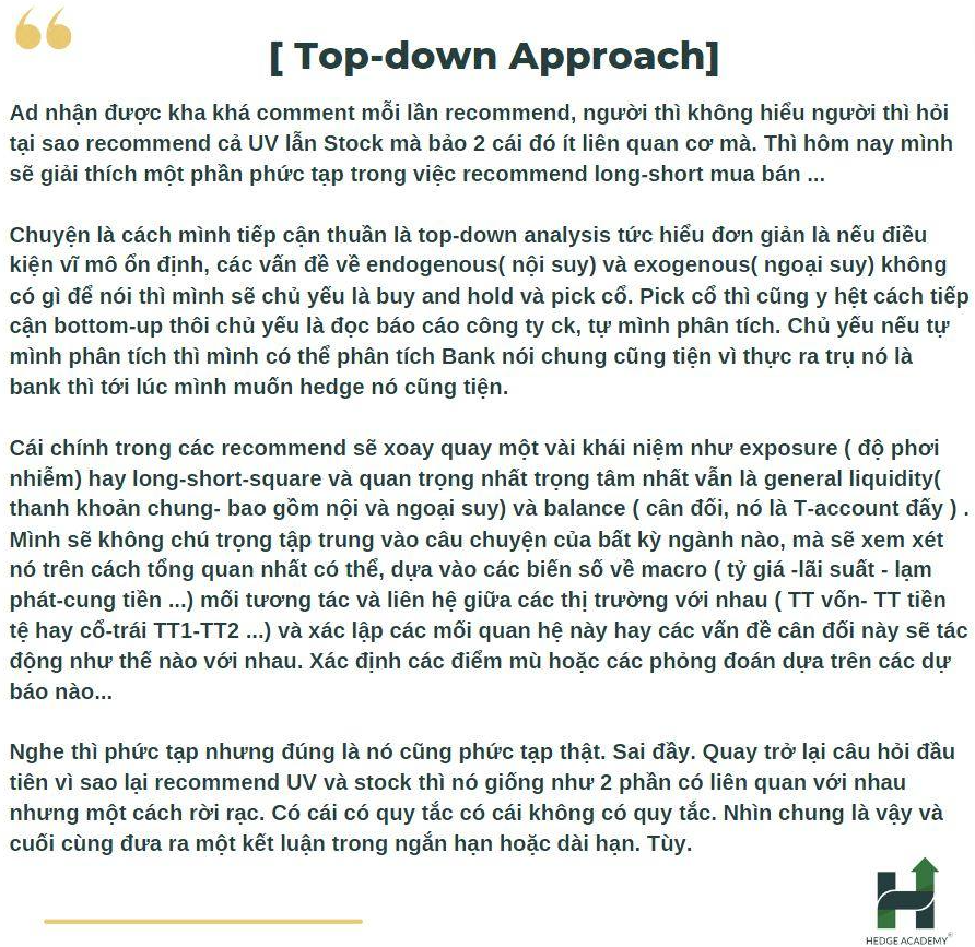 Chuyện là cách mình tiếp cận thuần là top-down analysis (phân tích từ trên xuống), hiểu đơn giản là nếu điều kiện vĩ mô ổn định, các vấn đề về endogenous (nội suy) và exogenous (ngoại suy) không có gì đáng nói, thì mình chủ yếu buy and hold (mua và giữ) rồi pick cổ (chọn cổ phiếu). Pick cổ thì cũng y hệt cách tiếp cận bottom-up (phân tích từ dưới lên), chủ yếu đọc báo cáo công ty chứng khoán (CK), tự phân tích. Chủ yếu nếu tự phân tích, mình phân tích bank (ngân hàng) nói chung cũng tiện, vì trụ cột là bank, đến lúc muốn hedge (phòng ngừa rủi ro) cũng dễ.