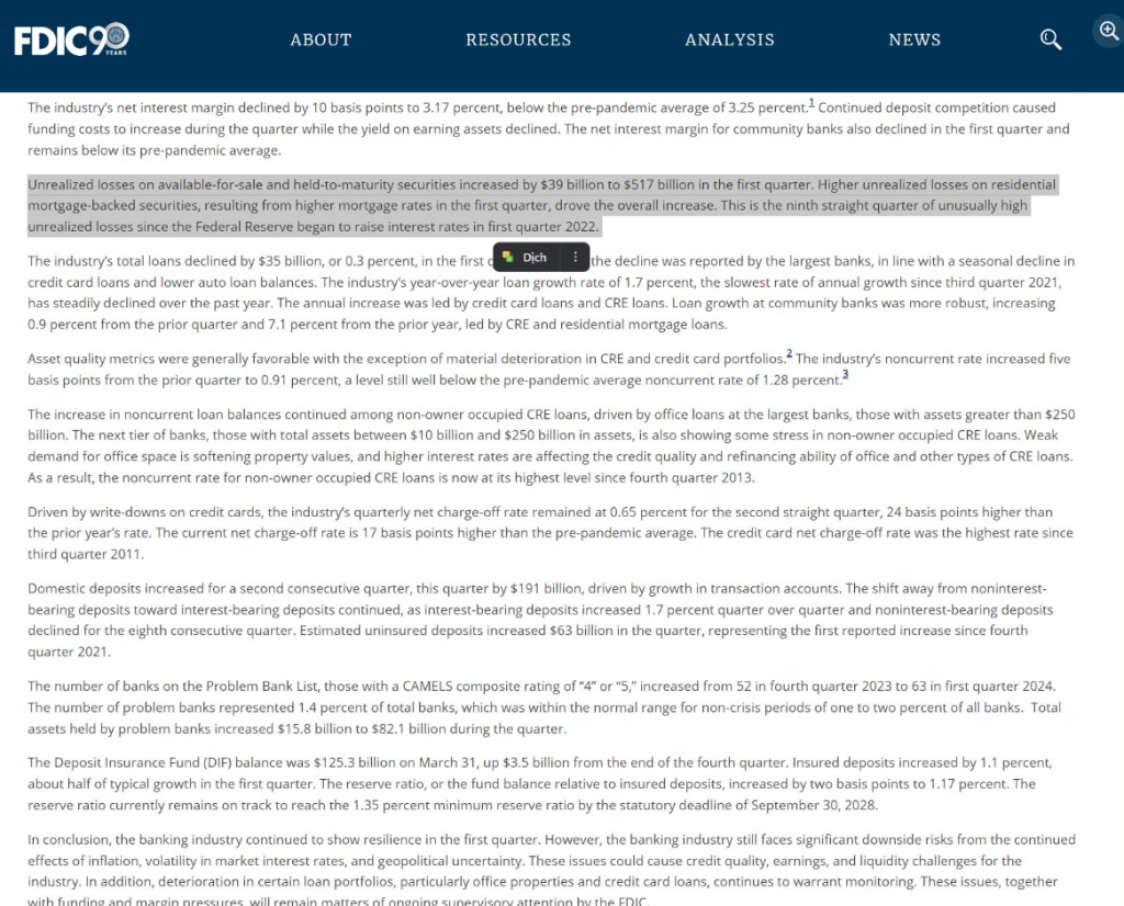 Gần như tất cả Unrealised (chưa thực hiện) của Mỹ nằm ở Banking Book, chỉ vô tình bị phân loại thành AFS theo kế toán, chứ theo Basel thì nó là Banking Book nhé. Rủi ro thì tính theo rủi ro tín dụng (trong case này = 0) và IRRBB (Interest Rate Risk in the Banking Book - rủi ro lãi suất trong sổ ngân hàng, cái này là chuyện khác). Nếu bank cứ kinh doanh, yên tâm NIM (Net Interest Margin - biên lãi ròng) từ Banking Book sẽ nuốt trọn phần này. Tóm lại, trường hợp này không cần dự phòng gì hết, con số loss (lỗ) 517 tỷ USD của FDIC (Federal Deposit Insurance Corporation - Cơ quan Bảo hiểm Tiền gửi Liên bang) công bố không có nhiều ý nghĩa.